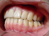 上の写真は、歯を横にずらした時のものですが、糸切り歯のあたりが接触して、奥歯の方が離れているのが分かるでしょうか?